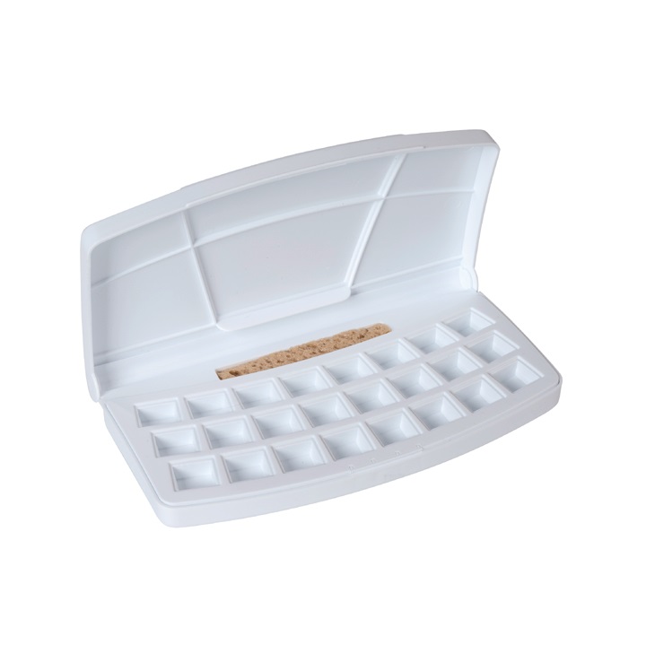 Die leere Kunststoffkassette Van Gogh ist ideal für Künstler, die gerne individuell ihre Farbpalette aufzufüllen. Es ist für Aquarellfarben Royal Talens Van Gogh konzipiert, aber Sie können auch andere Farben in den Pfannen verwenden. Sie können auch Aquarellfarbe direkt aus der Tube verwenden, die Sie in die Pfännchen pressen. Die Box hat bis zu 24 Pfannen für Aquarellfarben und einen Schwamm. Er ist sehr stabil, funktionell und aus Kunststoff gefertigt.